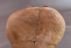This, combined with the open fontanel (the “soft spot”, or hole at the top of the head, shown with a blue arrow, right), the degree of suture closure and fusion (how the bone plates that make up the skull have grown and fit together), and the size of the skull, suggests that it is likely to be the skull of a newborn or infant.